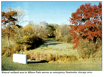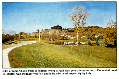 Dike System Protects Richland Center Realizing that local acceptance of the dike hinged on how local residents perceived it would look, Schreiber-Anderson Associates, Madison, WI made a visual assessment study of the impact of the dike and other features of the landscape. Their report included such features as alignment, side slopes to be used, added features to enhance the layout, and recommendations on the use of landscaping to reduce the visual impact. The contractor built a scale model of the dike through Krouskop Park, to show residents how the finished dike would look. The model is still on display in the city library. First, a road system was established to haul fill from borrow areas near the river and upstream from the dike construction sites. The haul road is now a major access point to the city's industrial park. Fortunately, where the haul road crossed the Pine River, there was an opportunity to take advantage of funds from the "timber bridge initiative" sponsored by the US Forest Service. The national initiative promotes the use of timber bridges built with locally grown woods. Wisconsin red pine and red oak were used to make 90-feet-long glued laminated beams. This type of timber bridge is relatively easy to construct and can be put in place rather quickly, using construction equipment usually available to county highway departments. Forest Products Lab monitors the bridge to evaluate its performance. Westbrook & Associates, Spring Green, WI, designed the bridge; Edward Kraemer & Sons, Plain, WI, was the prime contractor; and Sentinel Structures, Peshtigo, WI, was the fabricator. The first phase of the dike work was constructed to protect the Allison Park area at the north end of Richland Center. Completed in 1990, the dike is 4420 feet long with an average height of 12 feet, a base width of 80 feet and a top width of 10 feet. At the point where the dike entered the park proper, it was widened enough for the city to build a city street on top after construction was complete. A natural wetland on the land side of the dike serves as an emergency storage area to handle the 100-year flood in case the river is high and the gravity structures don't function. A 3-1/2 acre pond was excavated in Allison Park to serve as a second storage area and provide extra fill for the dike. The pond also helps to fulfill mitigation requirements as a result of work on the dike in wetlands. The Wisconsin Department of Natural Resources (DNR) stocked the pond with fish. This is a favorite fishing spot for the kids of Richland Center. Larry Allen, SCS, who was Project Engineer and Government Representative for SCS, (now retired), explains a unique system used to handle seepage water from the river during flood flows. "Seepage was a real problem," he said, "because a sand layer about 80 feet deep kept us from building a core trench under the dike. To compensate for this, we built a 3'-wide trench drain at the base of the dike on the land side." To build the drain, the prime contractor, Terra Engineering and Construction, Madison, WI, excavated a trench down to clean sand. After then going 2 feet deeper, the trench was backfilled with fine sand. A layer of coarse gravel was next. This was topped by "turfstones" with rectangular holes. Once this portion of the dike was completed, 352 trees and shrubs were planted in the fall of 1991 by Able Landscaping, Fond du Lac, WI, the landscaping contractor. In operation during high flood flows, seepage water comes under the dike and to the top of this trench drain. It then drains along this stone waterway into outlets where it is stored until the flood water level in the river drops. Since Richland Center had no storm drains, a stormwater diversion was constructed to divert stormwater runoff from 62.5 acres covered by streets and houses in the northern part of the city. A total of 9 drains across two of the streets intercept runoff water and carry it to Pine River in a 72-inch diameter R/C pipe. Joe Daniels Construction Company, Madison, WI, the prime contractor, completed this work in June, 1993. Daniels started construction of a 1,920 foot dike in Krouskop Park in the spring of 1992 and completed the work in June, 1993. Storm runoff on the land side of the dike is carried through a turfstone-lined waterway to several outlets that empty into the river. TNT Enterprises, Suamico, WI, planted 241 trees and shrubs on both the stormwater diversion section and the Krouskop dike section. A walkway created on the top of the dike is heavily used by people of all ages. Starting at the end of the Krouskop Park dike, two more sections totaling about 0.8 mile in length, were built to carry flood water safely past the rest of the city. Most of the side slopes are covered with lawn grasses, with Turfstone covering the rest. Edward Kraemer & Sons, Plain, WI, was the contractor. Construction began in August, 1993 and was completed three years later in September, 1996. Tillman Landscaping-Nursery, Green Bay, WI, planted some 400 trees and shrubs along the dike to create a park-like atmosphere. Many residents enjoy a walkway and bicycle path on top of the dike. A sloping concrete path makes the top of the dike handicap accessible. Five attractive wooden signs positioned at strategic locations, document the specific features of the installation at each spot. The ten home owners and one commercial property owner in the 100-year flood area protected by the project were given an opportunity to have their homes flood- proofed at the expense of the federal government and the city. Some homeowners accepted the offer. The city served as the general contractor to oversee the flood- proofing construction and coordinate activities between the various contractors. A flood warning system was designed by Midstates Associates, Baraboo, WI, as a part of emergency preparedness plan. The plan was prepared by Jim Owen Flood Loss Reduction Associates, Palo Alto, CA. Jim has developed similar plans f