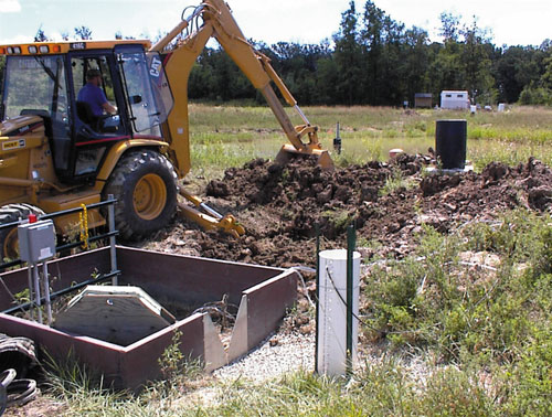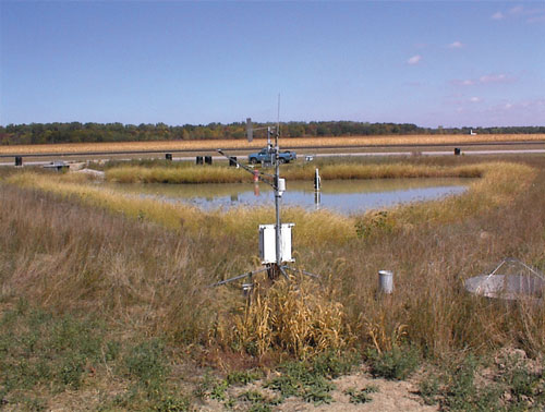 Drain pipes within the subirrigated field are spaced about 15 feet apart, with two newer 4-inch diameter CPT lines placed between each of the older ones (comprised of 4-inch diameter clay tile). The control plot contains only the clay tile lines and the spacing is 45 feet. To regulate the subirrigated field water table depths, three hydraulic control structures were installed. Surface and subsurface drainage from both fields are routed by gravity to a 1.4-acre wetland having a storage capacity of 1.0 million gallons. Water transfer between the wetland and a 1.57-acre, 2.3-million gal capacity reservoir occurs via a 2-hp or a 5-hp submersible pump, both located within an adjacent concrete sump. Either pump can be used when the system is in subirrigation mode. Local contractors completed Van Wert County, Ohio WRSIS construction in Fall 1996 at a total capital cost of $86,300. This site has silty clay soil covering three 15-acre fields: two that are subirrigated; and one with buried pipe used for subsurface drainage only. Surface and subsurface drainage from all 45 acres of corn and soybean cropland are routed, via two 1.5-hp submersible pumps contained in a concrete sump: to either a 1.95 acre, 2.3 million-gal capacity wetland; or a 3.0 acre, 3.4 million-gal capacity reservoir. A 1-hp submersible pump, also located in the concrete sump, is used for subirrigation. Drain lines within the two subirrigated fields have a spacing separation of 17.5 ft, and older 4-inch diameter clay tile pipe alternates with newer 4-inch diameter CPT. The control plot has only the clay tile drain lines, which are spaced 35 feet apart. Initially, two hydraulic control structures, one for each subirrigated field, were installed to regulate shallow ground water levels. However, like the Defiance County site, a wet zone within one of the subirrigated fields necessitated emplacement of an additional hydraulic control structure in Spring 1999. A shallow earth embankment attached to one side of the wetland was built during Summer 1999 to increase the residence time of water flowing from the inlet to the outlet. By doing this, wetland effectiveness for water treatment is improved.