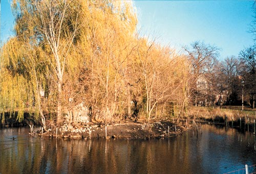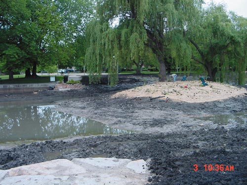 ![]() Indian Boundary Lagoon Island before construction. Introduction In February of 2001, the Chicago Park District awarded a new contract, Natural Resource Services, to The ServiceMaster Company for management of the Park Districts forty-six natural areas, including prairies, wetlands, lagoons, savannas, river edges, and woodlands. ServiceMaster assembled a team of natural resource experts including Integrated Lakes Management (ILM) and Conservation Design Forum, Inc. (CDF). ILM provides aquatic management expertise including diagnostic testing and consulting, while CDF provides ecological restoration and management expertise. Services also provided in this contract include natural area and habitat assessments in addition to new restoration projects. Indian Boundary Park, located on Chicagos far north side, was among the first in line for restoration. Background The lagoons north shoreline had similar problems. Several renegade access points left eroding bare spots along the emergent plant zone. Invasive non-native plant species were encroaching on the few native species present in the narrow upland buffer areas. Herbivorous waterfowl also prevented the establishment of native plant species. According to ILMs year 2000 Water Quality Report; excessive erosion, bare soils, undesirable fish species, and shallow pond depth contributed to a very high total suspended solids (TSS) value of 110 mg/l. The pond water was very turbid. TSS values greater than 25 mg/l are considered highly impaired as graded by Illinois Environmental Protection Agency (EPA) Lake Assessment Criteria (1992). Related to TSS is the secchi depth which is a measure of water clarity. Secchi depths less than 1.5 feet are also indicative of lake use impairment. Last year Indian Boundarys secchi depth was 0.25 feet. Add to that an elevated fecal coliform count (an indirect measure of animal waste) of 1,750 counts per 100 ml. The Illinois State standard starts at 200 counts/100 ml. The elevated fecal coliform count was due to the overpopulation of the pond and island by ducks and geese. The combination of all these factors, resulted in a murky-looking, unhealthy lagoon system. Design and Installation The shoreline of the island was regraded and covered with an erosion control blanket. On the east and west banks of the pond a 4 wide emergent shelf was prepared with a gradual transition to the existing slopes.
