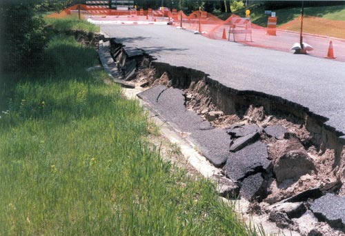 ![]() Photograph of the scarp displacement extending into the street near the right flank of the landslide. Introduction