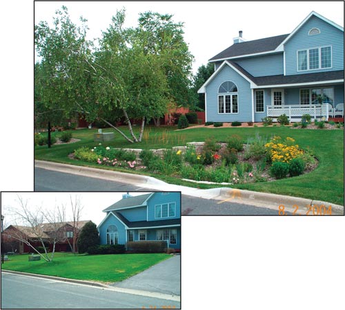 Although stormwater runoff carries more than 85 percent of pollutants to Minnesota’s lakes and rivers, the increasing volume of that runoff from impervious surfaces is just as big a problem. Parking lots, roads, and drainage pipes send stormwater directly into lakes and rivers; the amount and force of that runoff result in flooding and shoreline erosion, including the destruction of plants. In addition, the stormwater carries harmful substances to lakes and rivers: sediment, which reduces water clarity, and phosphorus from fertilizers, oil and grease and atmospheric deposition, which promote the growth of algae. One increasingly popular way to filter and reduce the volume of stormwater runoff is with rainwater gardens. By capturing runoff in shallow depressions and letting it to soak into the ground, rainwater gardens not only lowers the peak flow, but increases the base flow of water that reaches lakes and streams, but help recharge stores of groundwater in aquifers. Moreover, they filter out sediment and other pollutants like oil, grease, and heavy metals by catching about the first inch of runoff, which contains the highest concentration of pollutants. Rainwater gardens transform stormwater from a destructive carrier of pollution into a source of sustenance for plant and wildlife habitats: the plants thrive on nitrogen and phosphorus, while their stems trap sediment. Rainwater gardens are being incorporated into many new and existing areas for their environmental benefits, as well as their natural beauty. Minneapolis-based Barr Engineering Company began working with the city of Burnsville, Minnesota, in early 2002 to develop a plan for improving the water quality of Crystal Lake by adding rainwater gardens to a 20-year-old neighborhood. To measure the effectiveness of the gardens, two nearly identical neighborhoods were chosen for the project: one to be “retrofitted” with 17 rainwater gardens, and the other, just one street away, to serve as a control site. Leslie Yetka, a water resources specialist for the city of Burnsville, got the ball rolling by obtaining funds for a stormwater-treatment study $30,000 from the city and a $117,000 grant from the Metropolitan Council, which is a regional planning agency for the seven-county Twin Cities metro area. The challenge she faced was finding an affordable way to significantly reduce runoff from residential areas that already had curbing and conventional storm sewers in place. Leslie explains, “We didn’t have room for traditional treatment approaches such as stormwater ponds, so we needed to focus more on treating the runoff at its source, or basically at each home.” The Dakota County Soil and Water Conservation District provided initial technical expertise in evaluating alternative stormwater-treatment practices at a residential-lot level. Then Leslie hired Barr to help identify which treatment technique, within the scope of the study funds, would result in the greatest reduction of runoff. After discussing budgets, goals, options, and constraints, they determined that rainwater gardens offered the most promising solution for decreasing the amount of stormwater entering Crystal Lake. Barr would design the rainwater gardens and select appropriate plantings, as well as work with Leslie in educating homeowners and overseeing the construction process.