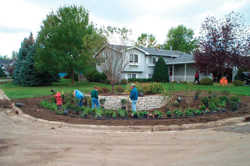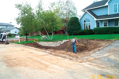 Before work on the rainwater gardens could start, two seasons’ worth of stormwater data from both the selected neighborhood and the “control” neighborhood needed to be collected. Barr installed gauges to measure how much runoff poured into Crystal Lake from each neighborhood. Later, the same gauges would show how successful the gardens were in reducing the volume of stormwater entering the lake. The next step, in March 2003, was to design the gardens. Kurt Leuthold, P.E., a Barr civil engineer, performed runoff calculations to determine the amount of stormwater that the neighborhood received annually; designed retaining walls to allow the gardens to exist a foot below street level and to keep their appearance neat; sized the gardens to fit within utility lines and city easements; and specified the removal and addition of soil where necessary to ensure that each garden had adequate drainage to the sand underneath them.