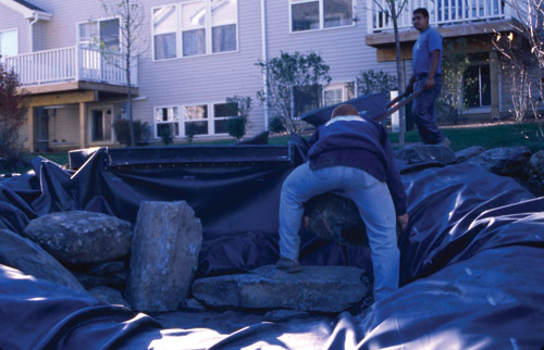 Streams and Waterfalls A waterfall and stream can be created at the outflow of a constructed wetland filter. The water flows through this patented natural filter, stripping it of sediment and nutrients as it passes through several layers of aggregate and aquatic plants. The vault has an easy access lid that allows the sediment loads to be pumped out on an as needed basis. This feature significantly reduces the need for costly and invasive dredging or excavation of sediment loads in the retention pond. The constructed wetland filter is modular and can be constructed in a variety of shapes and sizes. Like ornamental ponds, you can set the filter away from the pond and the water can twist, turn and tumble its way down a stream before entering the pond, or you can simply construct it into the margin of the pond and tap into the incredible filtration capabilities of the wetland filter. Always take the viewing areas into consideration when designing streams and waterfalls. Will they be viewed from 20 feet or 200 feet? On larger ponds and streams, I’ll typically use larger boulders. When working with large rocks safety is my number one priority. When laying out my streambed, I’ll pick out the areas where large rocks will be placed. Make sure you leave enough room in the stream to accommodate the stones. You don’t want to choke the stream down, so over-dig to compensate. After the liner is installed, position the boulders and then backfill with soil. You can also fill the void between the boulders and liner with smaller stones and gravel. Black foam should be used to divert the water as necessary. The finishing touches will remain the same. As you can see, we can transform ordinary retention areas into extraordinary water features. By following the same concepts used for smaller water features and incorporating a few specialized techniques, any pond can become a showplace. For more information contact Ed Beaulieu, V. P. Construction, Aquascape Designs, Inc., 1200 Nagel Blvd., Batavia, IL 60510, (866)877-6637, (630)326-1800, e-mail: tech@aquascapedesigns.com, website: www.aquascapedesigns.com. |