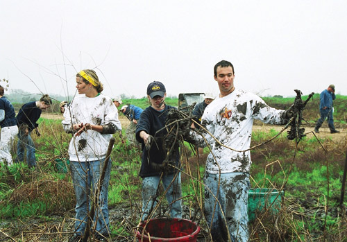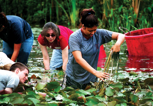 Valuable Education Resource The Research and Education Center is 6,000 square feet with a 1,500 square foot research area (Baylor University’s CRASR site), a 2,000 square foot nature center, and a 900 square foot indoor classroom installed with basic science equipment. Along some of the walking trails, observation platforms are constructed to provide access to the wetland for wildlife viewing. Baylor University has been an active partner with the City of Waco in the wetland project from the very beginning. Dr. Robert Doyle, Dean of Biology and Director of the CRASR at Baylor University, provided assistance in plant selection and establishment, and now teaches a wetland ecology course utilizing the Lake Waco Wetlands as an outdoor classroom and research project site. Several students are conducting graduate-level research in biology at the wetland, and other departments such as Geology and Environmental Studies have also been active. An additional experimental station is being constructed on site at the wetlands, the BEAR (Baylor Experimental Aquatic Research) facility will feature sixteen pond mesocosms (miniature wetlands) and twelve experimental stream mesocosms, these will mimic natural wetlands and stream habitats found in Central Texas. According to Dr. Ryan King, Assistant Professor for the CRASR, the goal is to identify the critical concentrations of nutrients that cause imbalances in the natural assembly of organisms, which will ultimately help develop water-quality criteria that protect aquatic resources in Texas from excessive pollution. Community Support The community outreach and education aspect of the wetland project has exceeded project leaders expectations, and only shows signs of increasing in the future. “Community support and involvement have without a doubt been the greatest success story of the wetland so far,” says Conry, noting “we’ve given out over 5,000 t-shirts during wetland plantings. We want to continue to build on that success and expand educational opportunities for people.” Guide books for wetland birds and another on wetland plants have been completed thanks in part by an Environmental Education EPA grant and are helpful resources in interpreting the plants and animals at the Lake Waco Wetlands. To date, there have been over 6, 000 volunteers out in the wetlands either harvesting, transplanting or maintaining the wetland plants this is equal to 10,000 volunteer hours that have been donated to the establishment of the wetlands. School groups and organizations continually participate in Fall and Spring plantings. Many of these groups are from the greater Waco area, but others have traveled as far away as San Antonio, Austin and Dallas. Locally, three major colleges and universities and over 24 independent school districts have participated in the volunteer opportunities offered at the wetland. The Lake Waco Wetland including the Research and Education Center is very unique to the community because within a 200-mile radius, it is the only wetland open to the public. The local community as well as people from as far away as Dallas and Austin have come to participate in wetland activities and attend workshops and programs on this natural environment. The City of Waco is the major financial institution responsible for the every day upkeep of the wetland and the Research and Education Center, and has entered into an agreement with Baylor University (CRASR and BEAR) and through their funding have been able to expand on the ongoing water research programs that are offered at the wetland facility. The research obtained by these localized studies will not only help Baylor University, but the city of Waco and its citizens by shared information on the quality of water in the North Bosque River. For additional information about the Lake Waco Wetlands Project, visit the City of Waco website at: http://www.waco-texas.com/city_depts/waterutilities/wetlands.htm or contact Nora Schell, Program Coordinator at the Lake Waco Wetlands, at noras@ci.waco.tx.us , (254) 848-9654 office. |