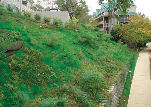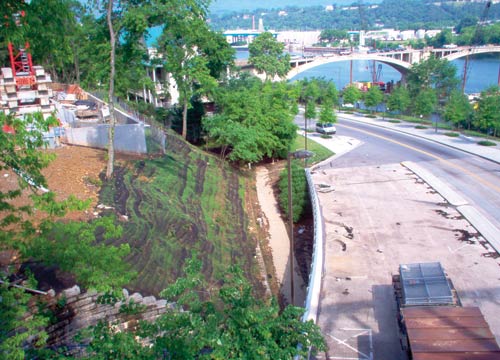 Coordinating a Vision Since the urban renewal program began, property values and general activity in the downtown corridor have increased. The centerpiece of the riverfront is the Riverwalk, a 22-mile public walkway next to the Tennessee River. The Riverwalk has offered residents and visitors to Chattanooga a unique opportunity to enjoy the river, but some problems still exist with adjacent property that are the result of years of erosion. Earthscapes, a Chattanooga company, was preparing to install a seeding project for a new condominium complex when the opportunity for expanded scope of work was realized. “We were simply seeding an area using compost when the owner of the complex asked if we could also help with the banks leading down to the river”, explained David Ramsey, President of Earthscapes. “The slopes had deteriorated due to the failures of several different solutions and other products used there. The soil was about as poor as we have in the area, so vegetation establishment was a challenge,” said Ramsey.