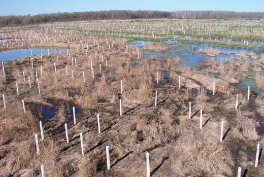 The staggering challenge put to the biologists of Davey Resource Group is to create in ten years a healthy start toward wetlands that has characteristics of one that has been developing over thousands of years. Because current monitoring standards measure success by the presence of climatic species rather than the successional colonizers that are found naturally in young wetland systems, biologists are essentially attempting to shortcut history. The mandate to move more quickly than nature is one that governs restoration efforts now, despite the fact that the validity of that approach will not be apparent for years.