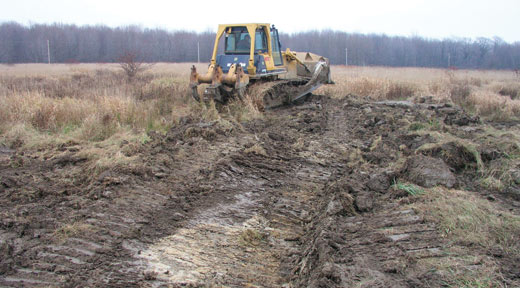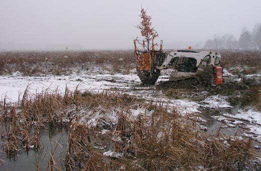 Much like the natural plant communities in northeastern Ohio, the Trumbull Creek Phase 2 site contained a mix of wetlands in the depressions created by upturned trees and upland characteristics. The goal of the restoration is to create the hummock/ hollow landscape throughout the site. This was partially met by eliminating drainage swales and installing ditch plugs that coaxed the water to meander through the restoration area. Berms that had been part of the original design were flattened to limit the depth to three feet to which water could be impounded. This was critical, because limiting unvegetated open water to less than 10 percent of the total area is one benchmark by which success of the project will be measured.