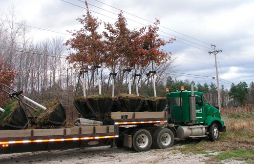 The larger trees were trucked to the site on a specially built semi-trailer in individual hydraulic tree pods from Davey's tree farm in Wooster, Ohio. The trees were removed from their travel pods and immediately spaded into their permanent locations.